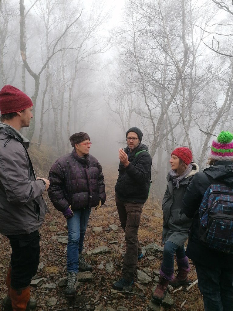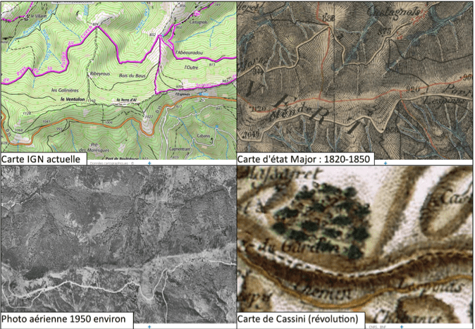 Emeric Sulmont nous a proposé de nous familiariser avec l’indice de biodiversité potentielle, un outil accessible aux néophytes qui permet d’évaluer la capacité d’accueil d’une forêt du point de vue de sa biodiversité. Il s’agit bien d’un outil d’estimation qui est d’autant plus performant et pertinent quand il permet de comparer plusieurs forêts entre elles et que le même observateur estime chacun des 10 critères à observer : Diversité d’essences d’arbres, diversité des strates de végétation, présence (et fréquence) de zones humides, de rochers, de milieux ouverts, de très gros bois vivant (> 70 cm de diamètre), de bois mort debout, de bois mort au sol, de microhabitats dans les arbres (= dendromicrohabitats ou dmh pour les intimes) et enfin un critère pas toujours facile à apprécier sur le terrain, le fait que la forêt qu’on inspecte est ancienne ou non. Pour estimer ce dernier critère, des cartographies anciennes ou des archives peuvent être intéressantes à explorer, le site géoportail.gouv.fr peut s’avérer très utile. De manière plus pragmatique la présence de terrasses de cultures ou de plantations d’essences exotiques démontrent que la forêt qu’on observe aujourd’hui est sans doute passée par une étape sans couvert forestier plus ou moins longue, ce qui impacte considérablement la biodiversité du sol. Evidemment l’abondance d’arbres séculaires est l’indice le plus probant, mais il n’est pas systématique dans les forêts anciennes.