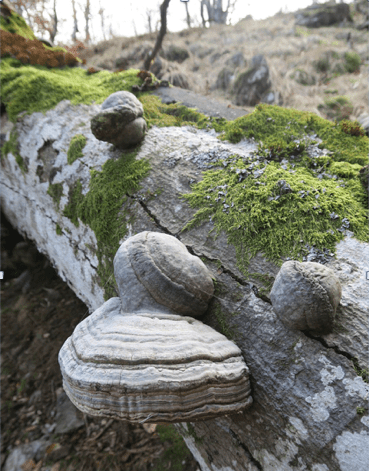 Evidemment associé au bouleau nous découvrons le fameux chaga (Inonotus obliquus), le champignon réputé pour ses vertus immunostimulantes notamment (et que Ötsi avait aussi dans sa besace). Il est rare en Cévennes et cantonnée aux belles boulaies sénescentes de versant nord. Il s’agit là de la forme imparfaite, celle-là même qui est broyé pour faire des infusions ou décoctions. La forme parfaite du champignon est plus fugace et discrète (sous les écorces), c’est elle qui émet des spores. Ici, notre Chaga ressemble à une sorte de loupe carbonisé.